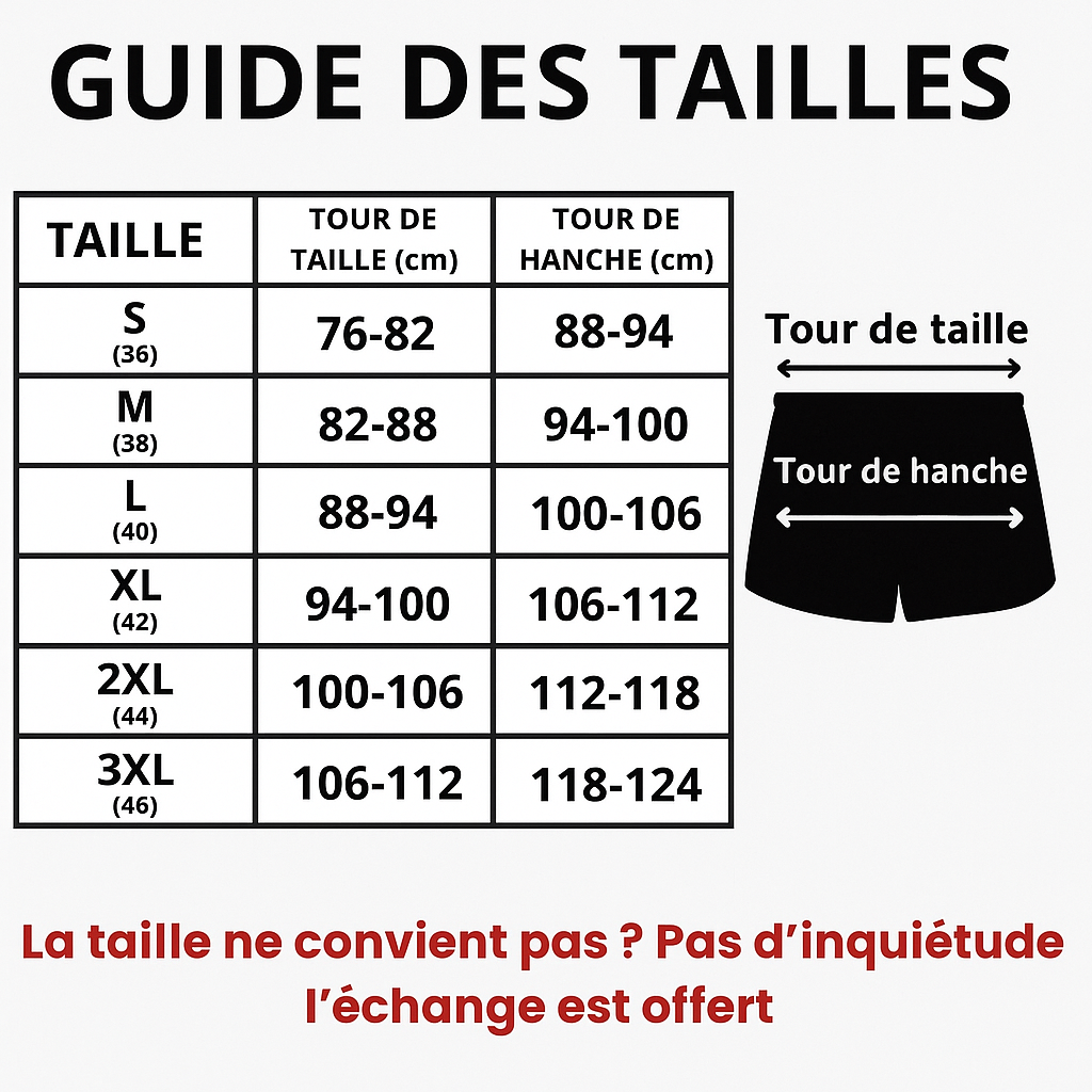 Il suffit de prendre ta taille habituelle de sous-vêtement. Le tissu est stretch, donc il s’adapte facilement à ta morphologie. Si tu es entre deux tailles, on recommande de prendre la plus grande pour plus de confort.